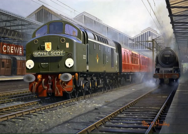 The southbound ‘Royal Scot’ sweeping through Crewe station headed by an English Electric Type No. D212 ‘Aureol’.