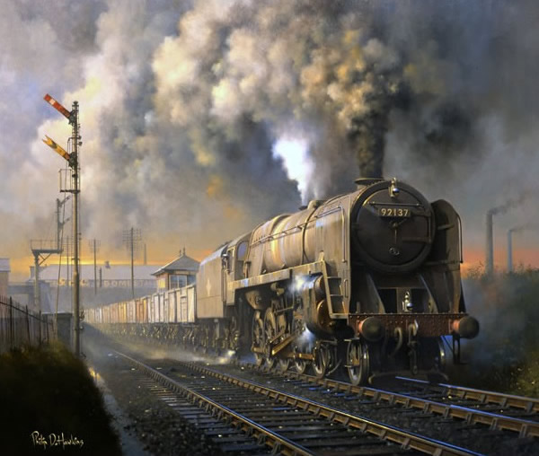 A beautifully evocative portrayal of a BR Standard 9F 2-10-0 as they really were. No.92137 from Saltley shed gets to grips with a southbound coal train passing beneath the Birmingham New Street to Euston main line and over Brickyard Crossing, Birmingham, on the climb up to Camp Hill C1960.