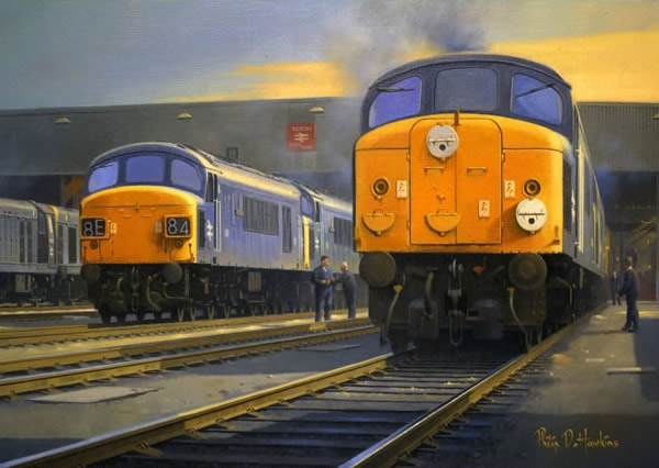 Corporate blue livery at Toton depot during 1974 with class 44 No. 44002 ‘ Helvellyn’ and class 45 No. 100 ‘Sherwood Forester’.