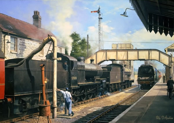 The Somerset & Dorset Railway really came to life on summer Saturdays, particularly during the 1950’s. One of the lines Derby built 2-8-0’s No. 53808 and a 2P 4-4-0 No. 40700 double-head a southbound train whilst a train from the south arrives behind a West Country No. 34043 ‘Coombe Martin’.