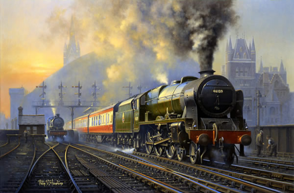 A Leeds Holbeck allocated rebuilt ‘Royal Scot’ 4-6-0 No.46109 ‘Royal Engineer’ has found its way south and is making a noisy start out of St Pancras with an early morning express to return north during the early 1950s. This loco was built for the London, Midland & Scottish Railway by the North British works in 1927, rebuilt with a taper boiler in 1943 and withdrawn from BR service in 1962.