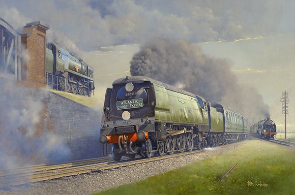 In support of the appeal to cosmetically restore locomotive No. 34051 ‘Winston Churchill’ the Friends of the National Railway Museum have commissioned a new painting from Philip D Hawkins FGRA of three NRM locomotives at Battledown flyover on the south-western main line in the summer of 1960.