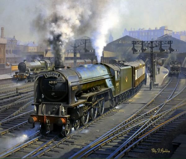 One of the handsome Peppercorn ‘A1’ Pacifics No.60131 ‘Osprey’ leaves Leeds Central Station with the ‘Yorkshire Pullman’ bound for London, Kings Cross C1959. On the left a ‘Jubilee’ 4-6-0 No.45698 ‘Mars’ awaits departure time with a Liverpool train whilst one of Copley Hill sheds’ J50 tank engines busies itself with station pilot duties. The station closed to all traffic in 1967.
